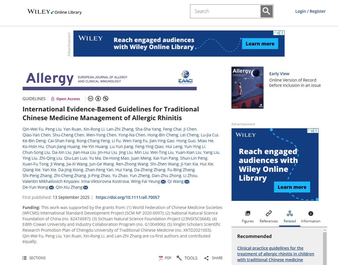 近日,由伟德国际集团教授、四川省整合医学会会长张勤修教授团队牵头制定的全球首部变应性鼻炎国际中医药防治指南——“International Evidence-Based Guidelines for Traditional Chinese Medicine Management of Allergic Rhinitis”在国际过敏与免疫学领域顶刊《Allergy》(中科院一区,TOP期刊)正式在线全文发表。这是《Allergy》创刊以来首次发表中医药指南,标志着中医药防治变应性鼻炎的研究成果首次以循证医学标准走向国际舞台,填补了中医药在国际过敏疾病诊疗指南中的空白。Allergy杂志主编、瑞士达沃斯过敏与哮喘研究所(SIAF)所长Cezmi在回复中称该文 a very important article。