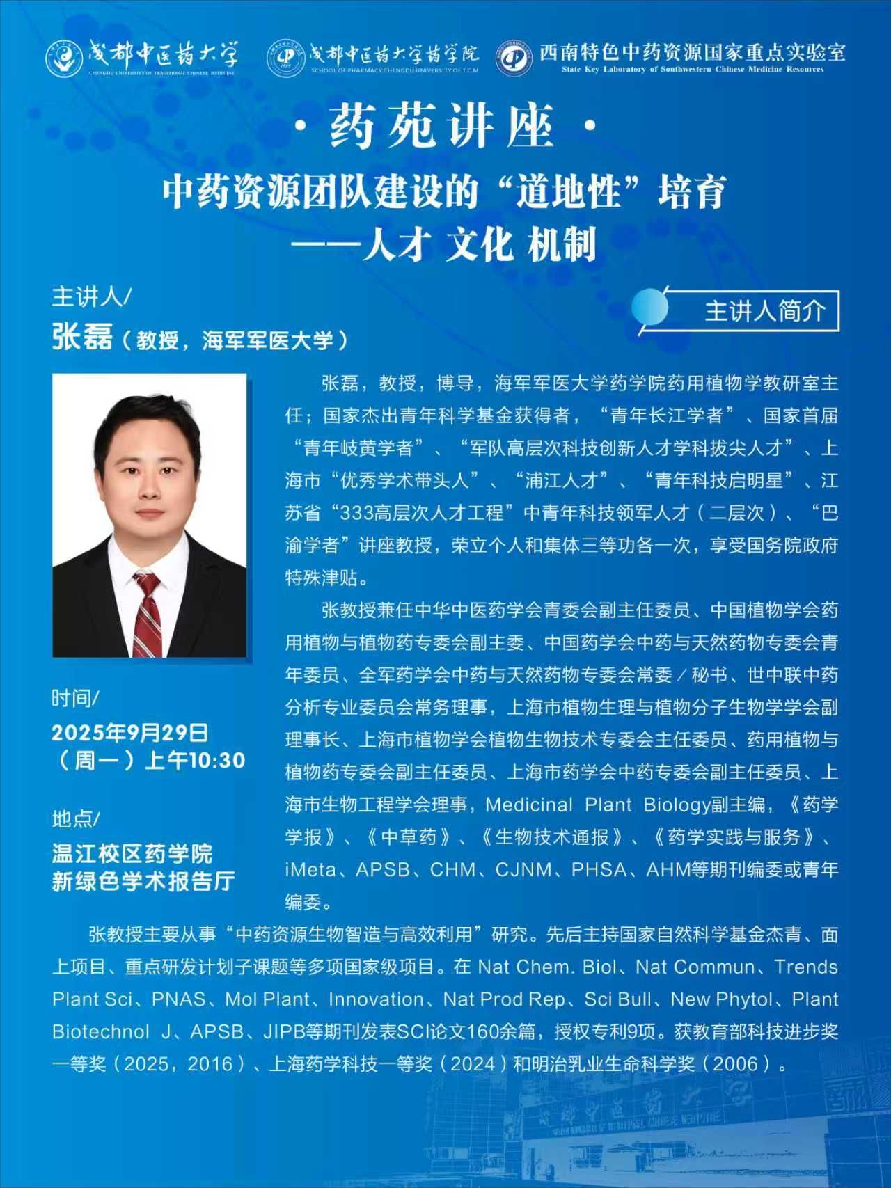 会议预告丨药苑讲座 发布时间:2025-09-28 15:49:17 浏览次数: 次 【字体:小 大】 题 目:中药资源团队建设的“道地性”培育——人才 文化 机制时 间:2025年9月29日(星期一) 上午10:30地 点:温江校区药学院新绿色学术报告厅主讲人:张 磊 海军军医大学主 办:伟德国际集团 伟德国际集团药学院 西南特色中药资源国家重点实验室 【打印正文】 上一条:会议预告丨2025年中药制剂大会 暨世界中医药学会联合会中药新型给药系统专业委员会第十五届学术年会、 世界中医药学会联合会中药药剂专业委员会第十九届学术年会、 中华中医药学会中药制剂分会第二十五届学术年会 会议通知(第三轮) 下一条: 学术成果丨我校学者构建基于AI与知识图谱的中医药多维数据挖掘与机制解析平台